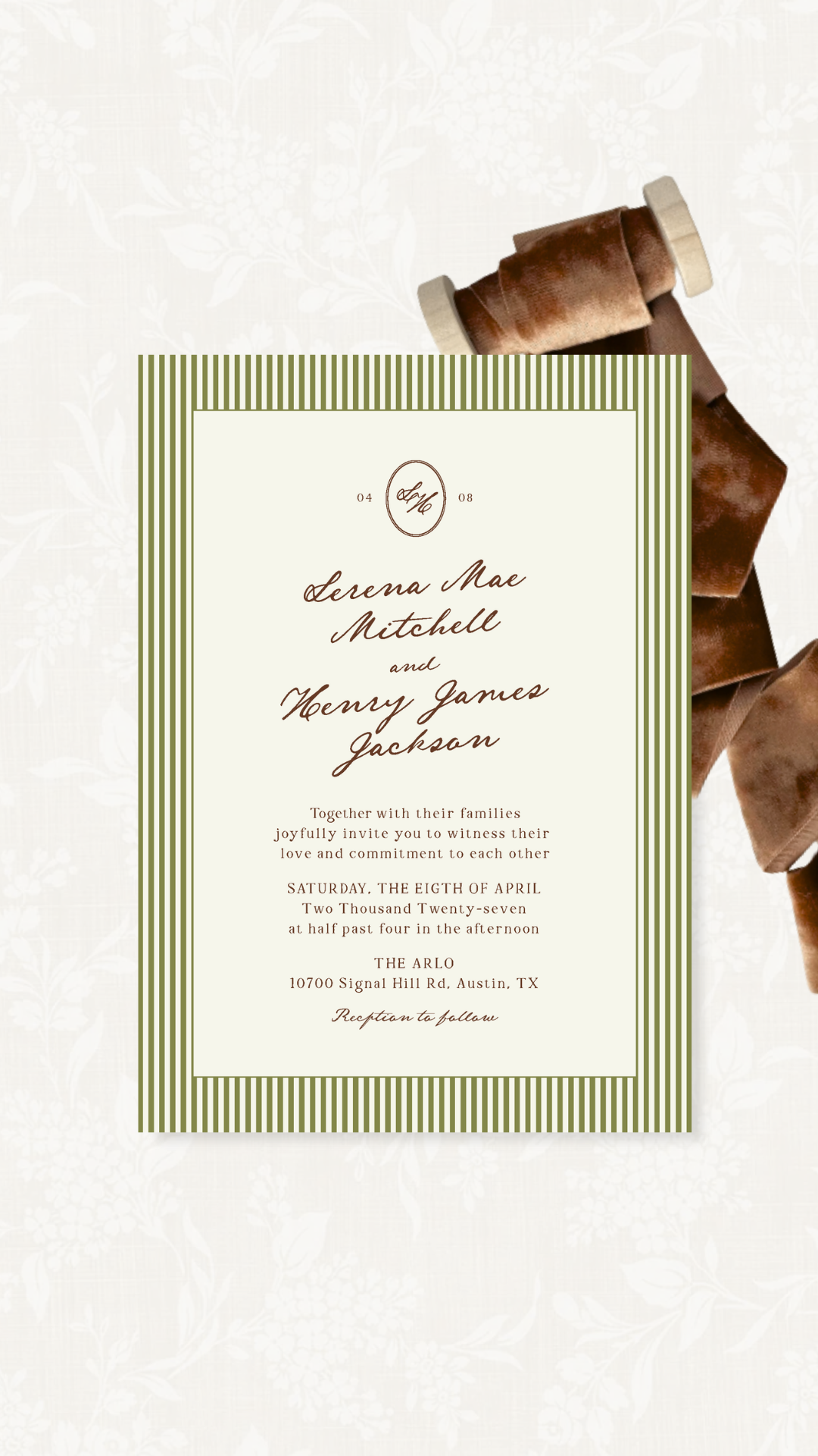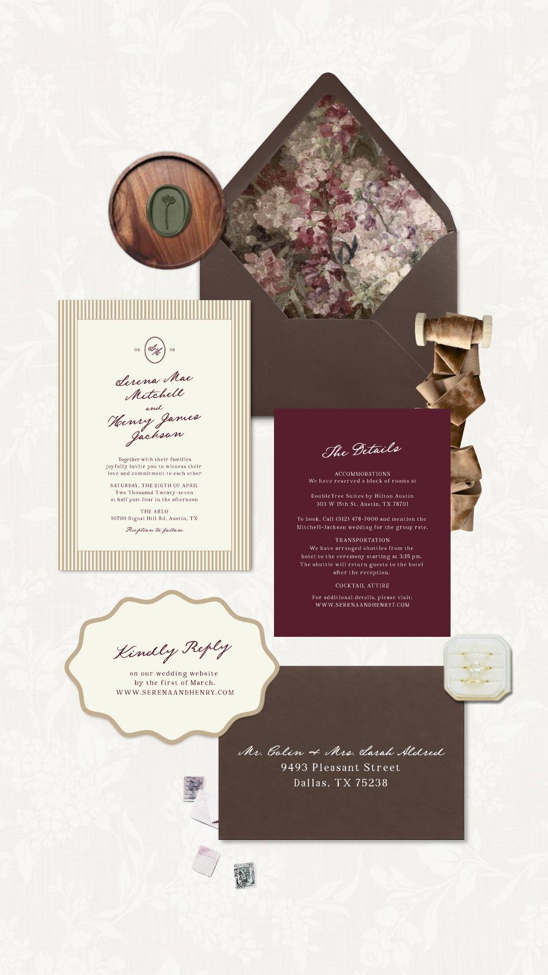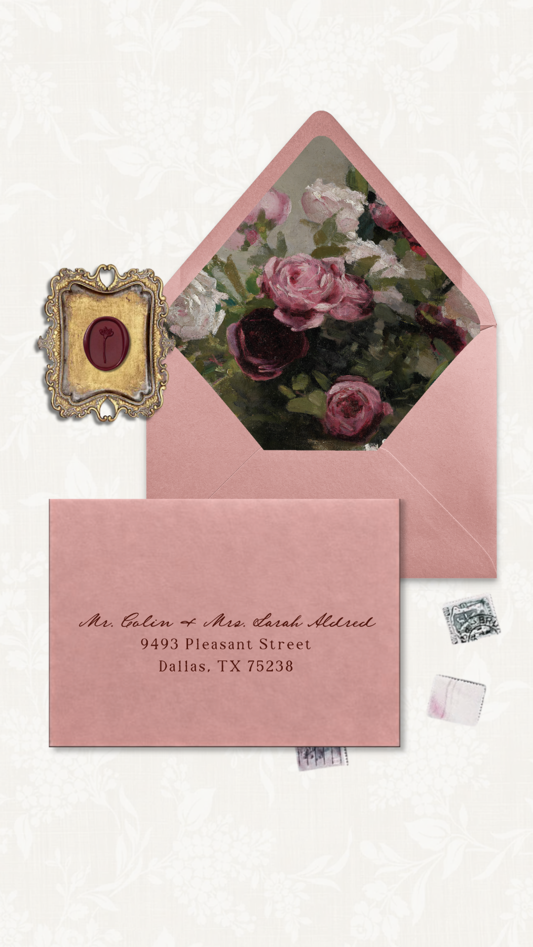 Softly romantic and painterly in feel, this suite is inspired by classic still-life florals and vintage European stationery. A delicate handwritten script paired with subtle stripe detailing adds charm and character, while muted blush tones and sage accents create a warm, heirloom palette. Finished with a floral art envelope liner, organic wax seal, and hand-torn silk ribbon, the suite feels intimate, elegant, and timelessly feminine.